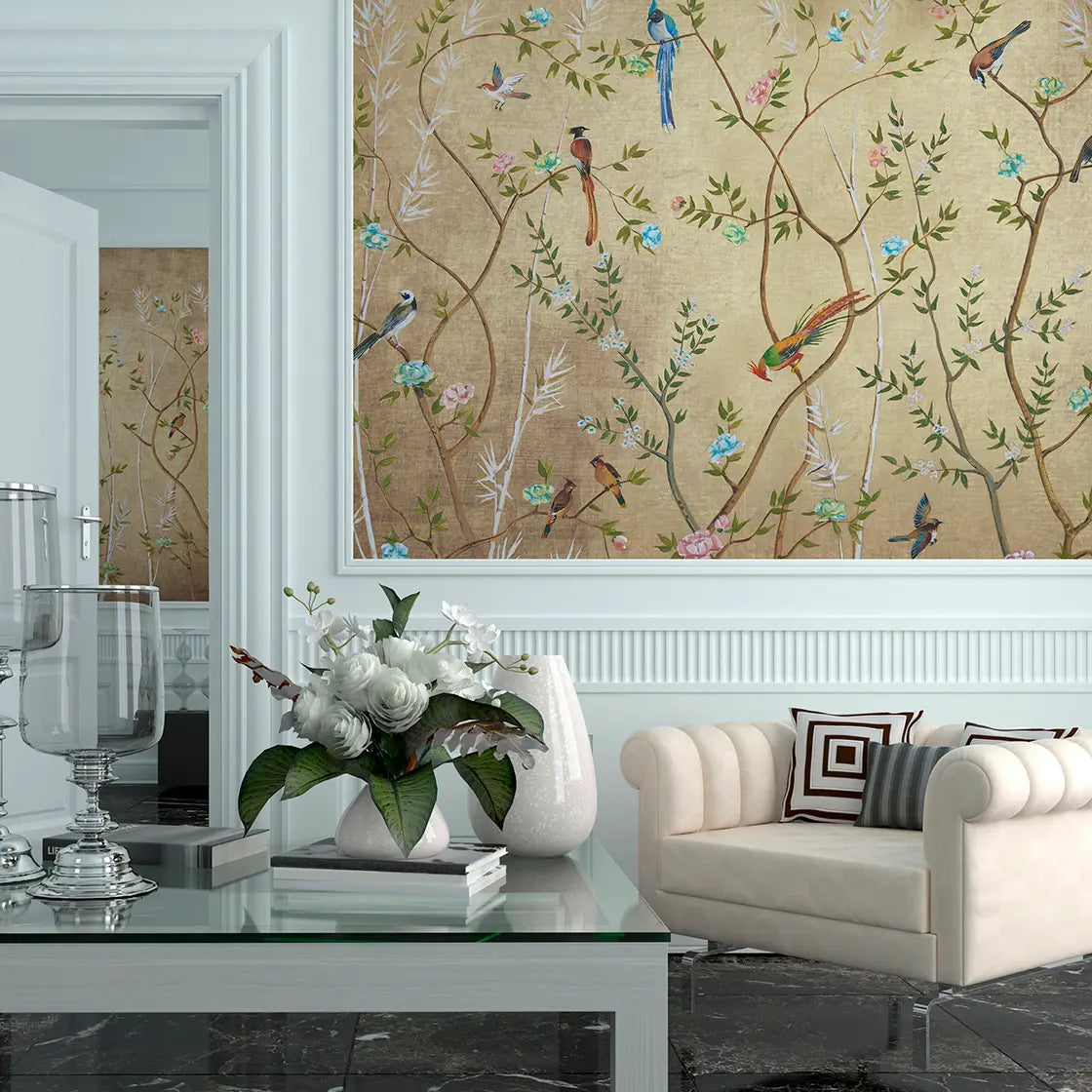 Birds Garden beige mural 424 cm. width x 280 cm. height, easy to apply. It is wallpapered with strips numbered from left to right Light resistance: Good Report: Exact Washability: Washable Gluing: Gluing the Wall Color: beige Material: TNT Non Woven UNCOATED METALLIC